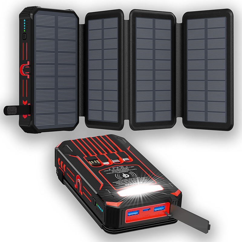 Solar Charger Power Bank-20000mAh Wireless Portable Charger Built-in 4 Cables and 4 Solar Panels, PD QC Fast Charging USB C Battery Pack with Flashlight for Camping Travel
