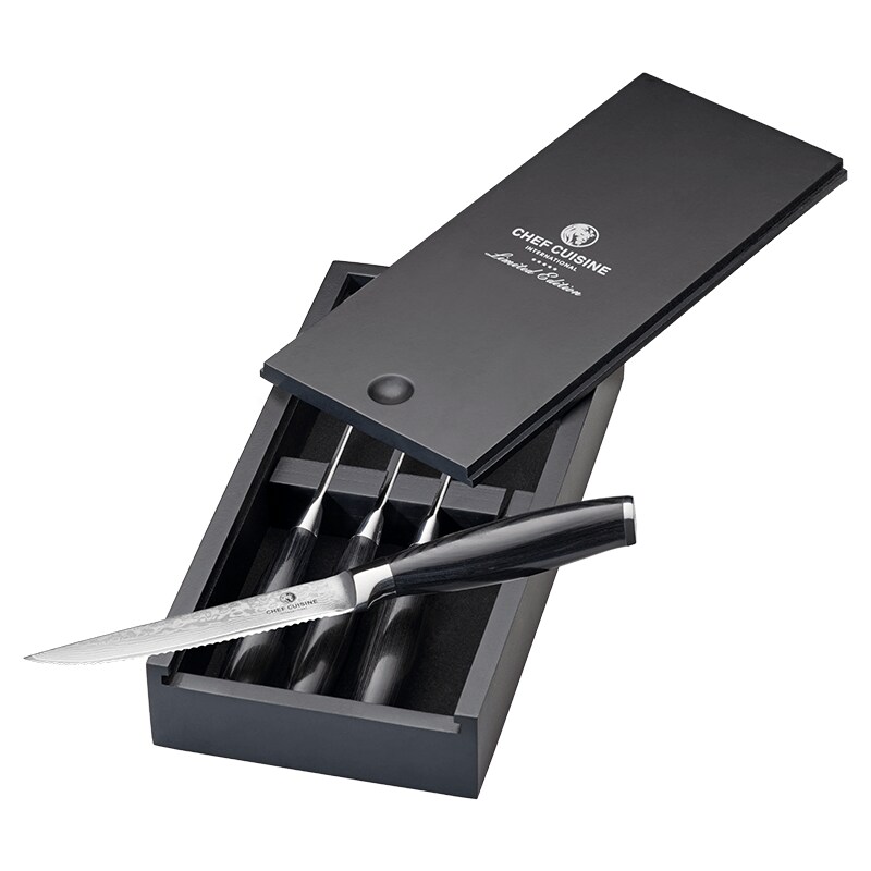 CHEF CUISINE Damast Steakmesser Set mit Pakkaholzgriff – 4 handgeschliffene Steakmesser aus 67-lagigem Damaszenerstahl mit Aufbewahrungsbox