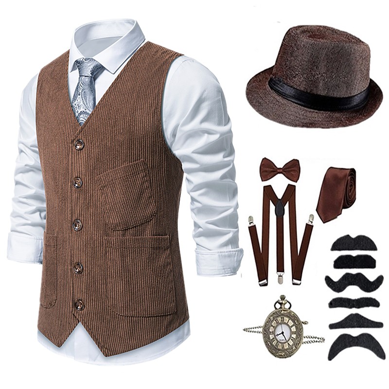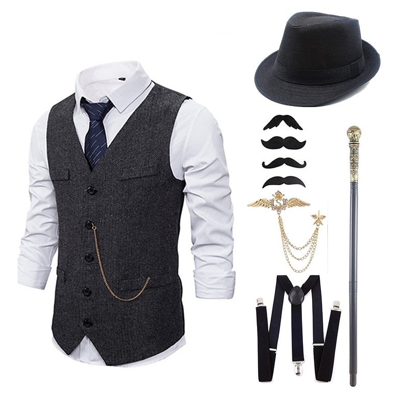 Retro Vintage Roaring 20s 1920s Outfits Waistcoat Accesories Set Gentleman Gangster Fancy Dress Men's Halloween Carnival New Year Carnival Party / Evening Masquerade Adults' Cravat Vest Hat All
