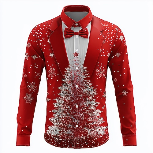 Weihnachten Herren Schneeflocke Weihnachtskostüm Smokinghemd mit Anzugkrawatte und Aufdruck Hemd Knopfhemd Langarm Lustig Outdoor Ferien Frühling Herbst Umlegekragen 3D-Druck Hemden mit Kragen Rot 1