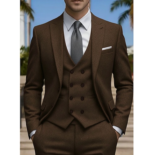 Uomo Matrimonio Feste Completi in Tweed Bavero a lancia Nero Caffè Quotidiano Casual Tinta unita Vestibilità su misura 3 pezzi Monopetto Due Bottoni