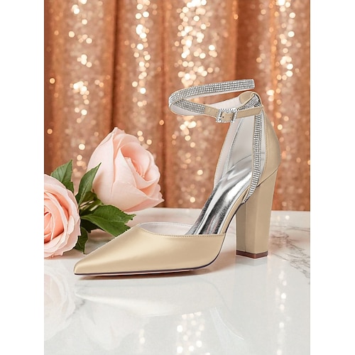 Champagnerfarbene Brautjungfernschuhe für Damen – elegante Pumps mit spitzer Zehenpartie und Blockabsatz, verziert mit Kristallen, perfekt für die Brautgesellschaft.