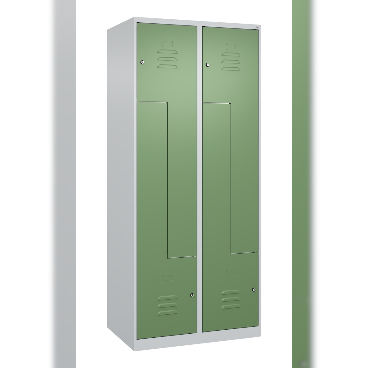 Doppelstock-Spind Classic PLUS, 2 Abteile, lichtgrau / resedagrün, HxB 1950 x 600 mm, mit Bodensockel, Drehriegel C+P
