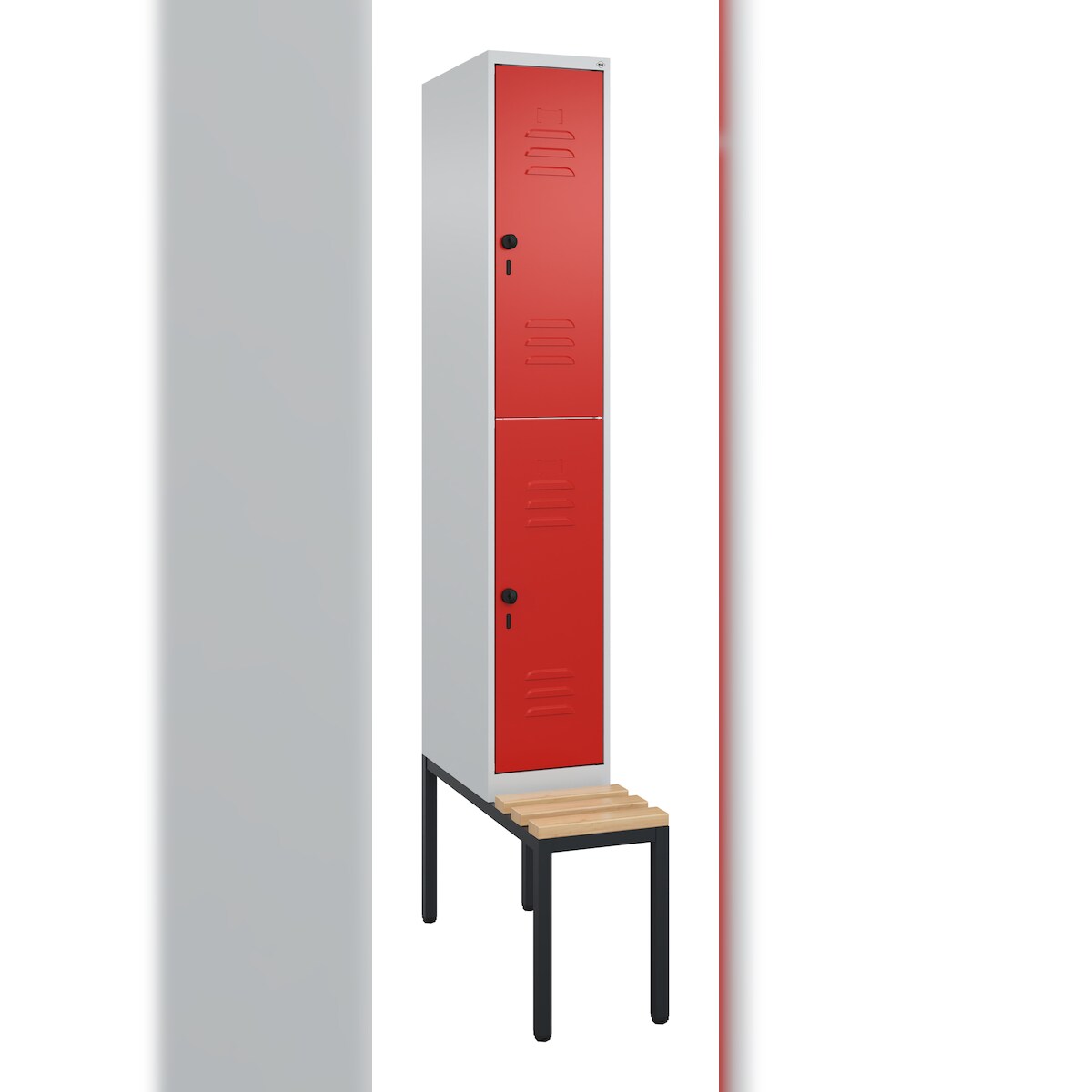 C+P Spind Classic PLUS, Buche untergebaute Sitzbank-Harthol, 2 Abteile, HxBxT 212x30x82cm, Sicherheitsdrehriegel, Hellgrau/Rot von PROREGAL