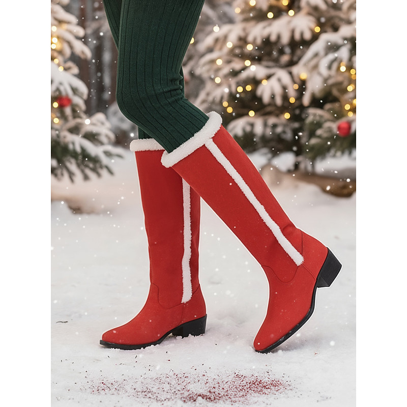 Women's Red Faux Suede Knee-High Boots – Elegant Sherpa-Lined Winter Boots for Christmas Outfits, Cold Weather Walks and Holiday Gatherings