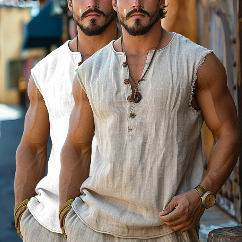 Men's Henley Shirt Vest Top Linen Tank Top Sleeveless Shirt Sleeveless Henley Summer Plain Fashion Designer Bohemian 2 Piece Multi-pack Vacation Casual Going out WhiteKhaki Black Khaki BlueKhaki