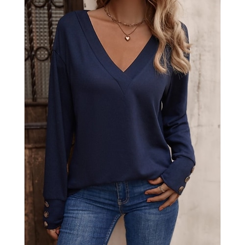 Per donna Maglietta Tinta unica Moda Elegante Classico Manica Lunga Scollo a V Top Regolari Quotidiano Uscire Weekend Bottoni Blu Nero Bianco Rosa Vino Primavera Autunno