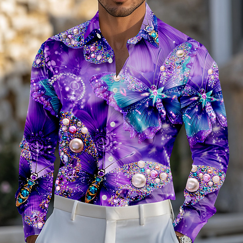 Mardi Gras Men's Butterfly Pearl Dazzle color Shirt Satin Shirt Dress Shirt Long Sleeve Fashion Casual Party Holiday Summer Spring Turndown 3D Print Button Up Shirts Purple