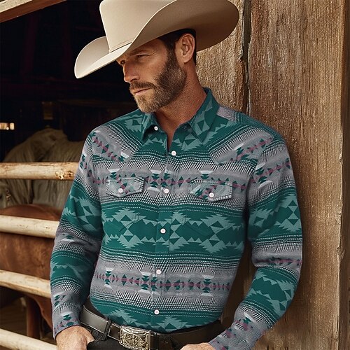 Per uomo Geometrico Azteco Cultura indiana Camicia Camicia Western Camicia da cowboy Manica Lunga Vintage Retrò Casuale All'aperto Abbigliamento da lavoro Primavera Autunno Collo ripiegato Due tasche