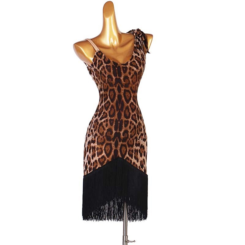 Women's Leopard Print Latin Dance Dress with Fringe Hem, Adjustable Strap, and Sexy Tie-Shoulder Detail – Perfect for Salsa, Rumba, and Performance Wear