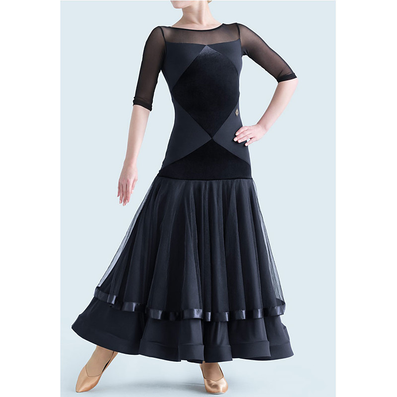 Women's Ballroom Dance Dress Half Sleeve Mesh Waltz Tango Latin Practice Competition Performance Gown Elegant Black Layered Chiffon Skirt