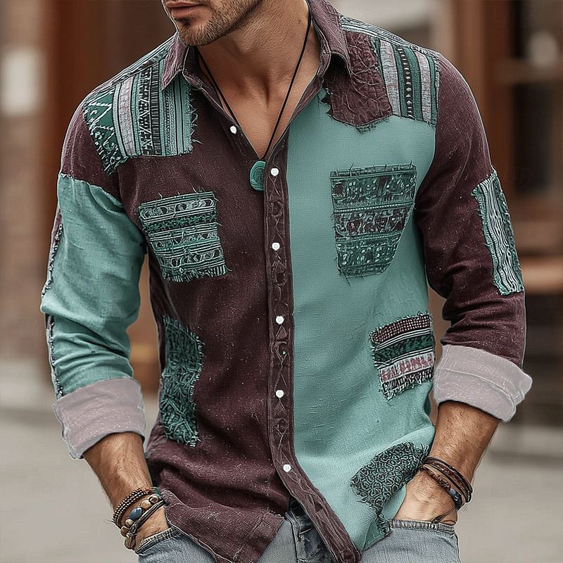Men's Color Block Patchwork Shirt Button Up Shirt Long Sleeve Vintage Retro Outdoor Daily Streetwear Spring Fall Turndown 3D Print Front One Pocket Linen Like Shirt Red Blue Purple Orange Green
