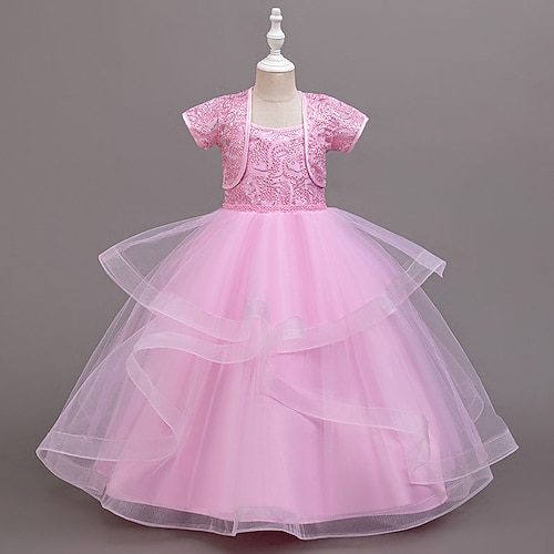 Abito da damigella d'onore bambina Ragazze Abito formale Abiti da sposa Feste Matrimonio Formale Adorabile Principessa Patchwork Rete Tinta unica Manica Corta Girocollo Champagne Rosa Dai 4 anni in su