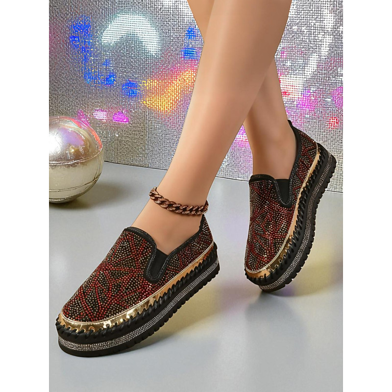 Women's Black Gold Rhinestone Slip-On Platform Loafers, Sparkly Chunky Sole Party Shoes for Nightlife Club Outfits