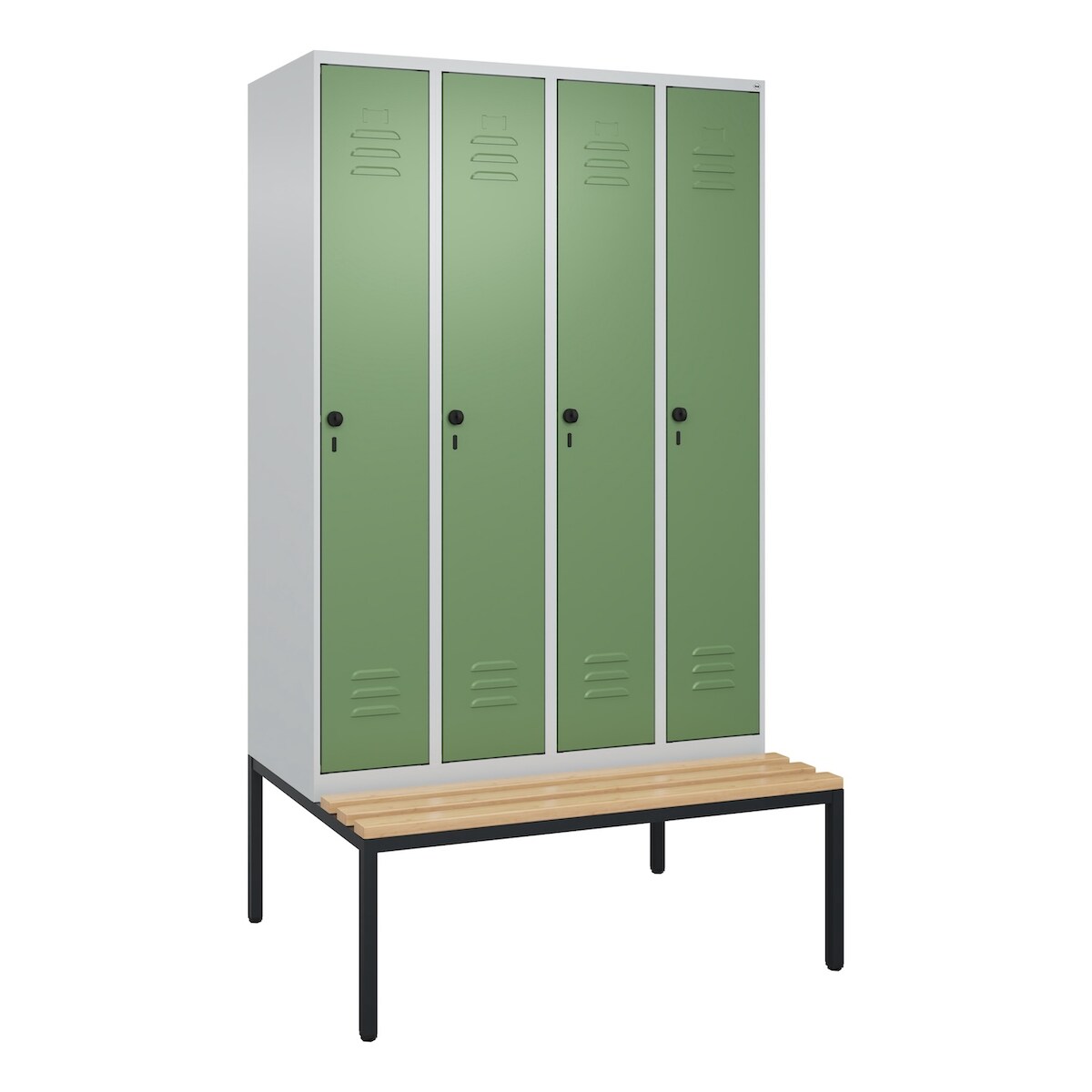 C+P Spind Classic PLUS, Buche untergebaute Sitzbank 4 Abteile, HxBxT 212x120x82cm, Sicherheitsdrehriegel, Hellgrau/Resedagrün von PROREGAL