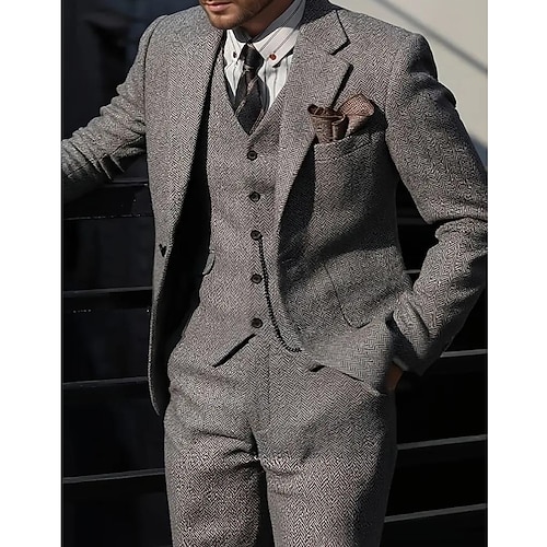 Uomo Matrimonio Affari Completi in Tweed Bavero classico Grigio scuro Quotidiano Casual Spina di Pesce Vestibilità su misura 3 pezzi Monopetto a un bottone