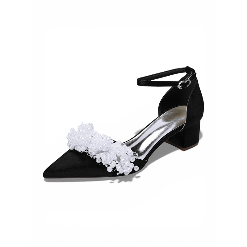 Women's Wedding Shoes Pumps Bridal Shoes Rhinestone Chunky Heel Pointed Toe Luxurious Satin Buckle T-Strap Wine Black White
