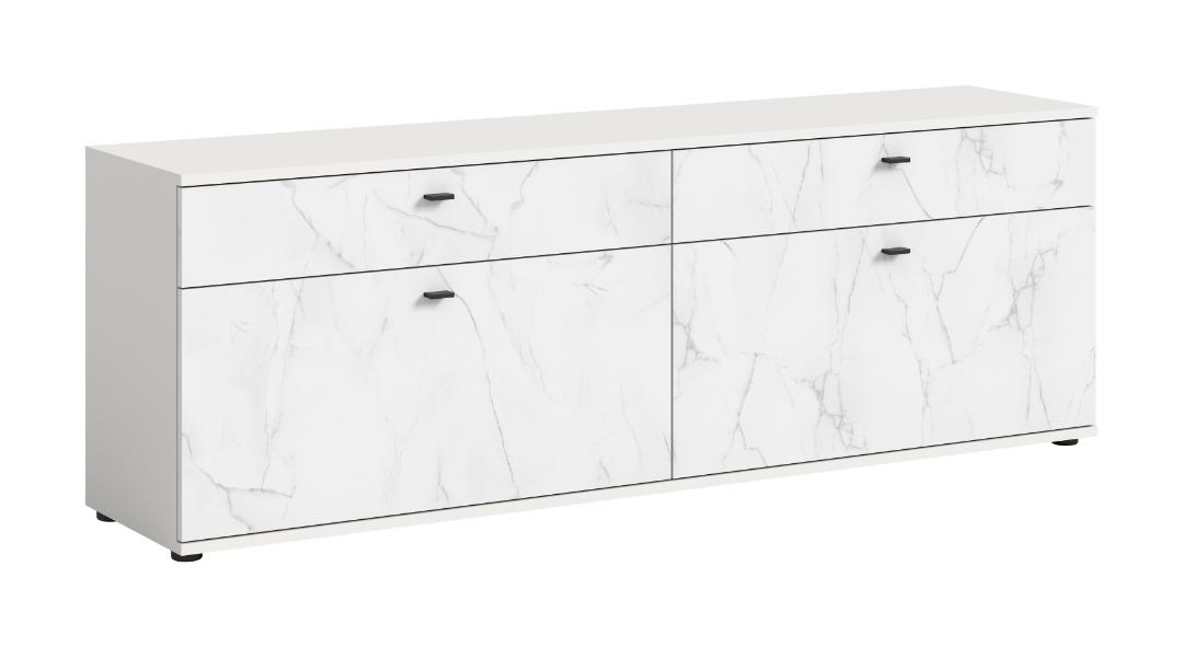 Stone TV Tisch 2 Klappentüren, 2 Schubladen Marmor Dekor weiß.