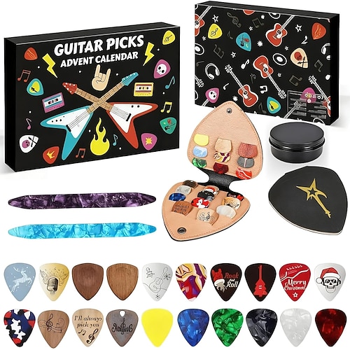 Calendario dell'avvento 2025 con plettri per chitarra per adolescenti adulti, calendario con conto alla rovescia di 24 giorni con 20 plettri e accessori, regalo di Natale da collezione per chitarristi