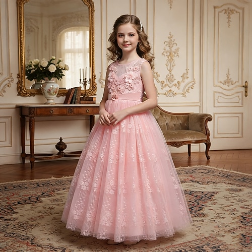 Abito da damigella d'onore bambina Ragazze Abito formale Abiti da sposa Feste Matrimonio Formale Elegante Principessa Dolce Pizzo Rete Tinta unica Senza Maniche Girocollo Rosa Azzurro cielo Dai 4