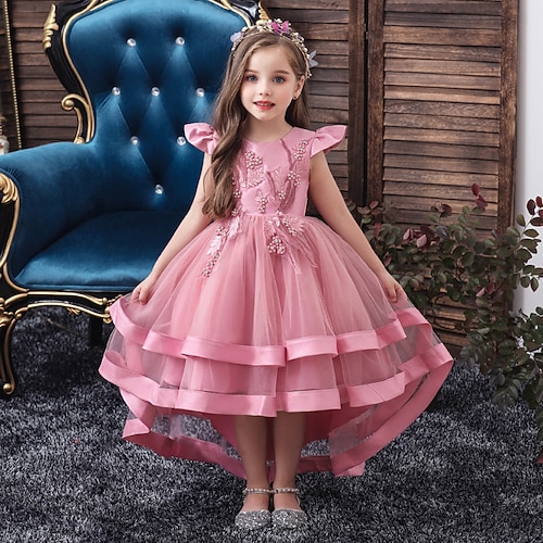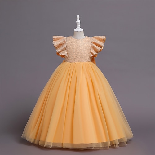 Abito da damigella d'onore bambina Ragazze Abito formale Abiti da sposa Feste Matrimonio Formale Adorabile Principessa Patchwork Rete Tinta unica Manica Corta Girocollo Champagne Rosa Dai 4 anni in su