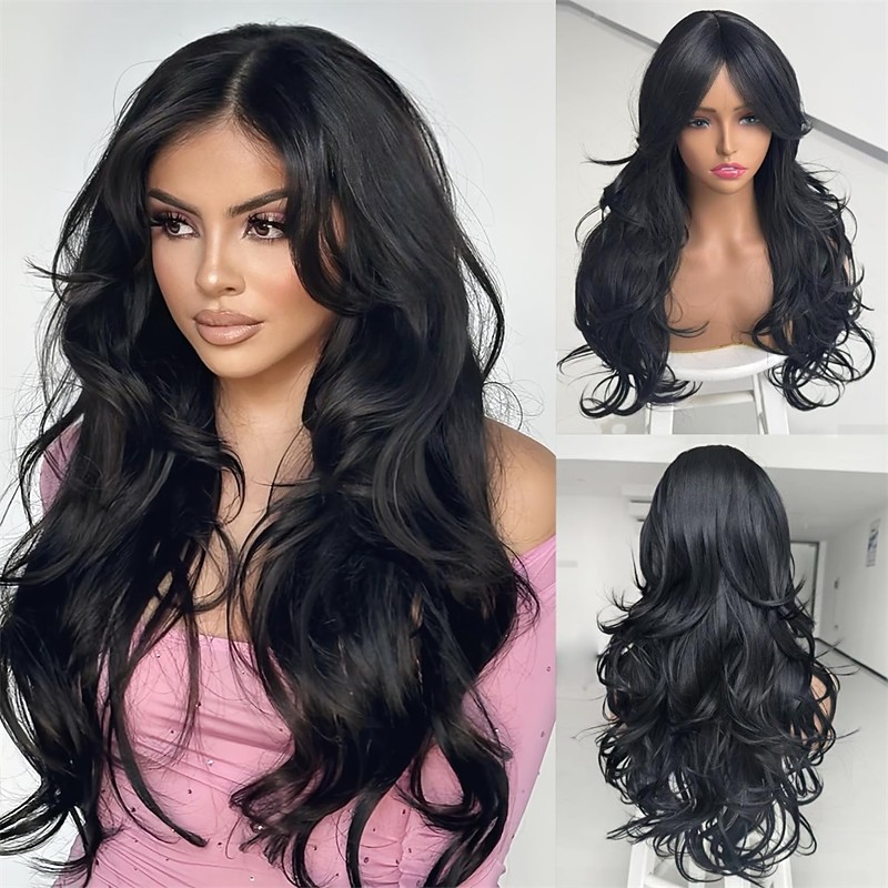 Black Wig with Bangs for Women Long Wavy Wigs Curly Synthetic Wig Natural Looking Hair Heat Resistant Wigs for Daily Party Use