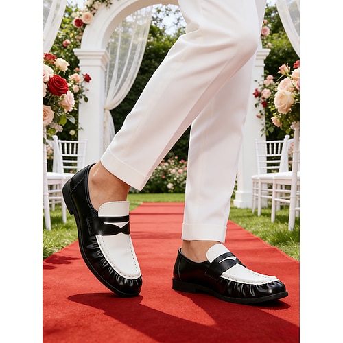 mocassini slip-on da uomo neri e bianchi, elegante design bicolore, vestibilità comoda per matrimoni in giardino, riunioni formali e cerimonie speciali