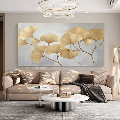 foglie di ginkgo dorate dipinte a mano, pittura a olio su tela, arte murale floreale metallica dipinta a mano, design astratto di foglie, arredamento di lusso per la casa, decorazione moderna su tela