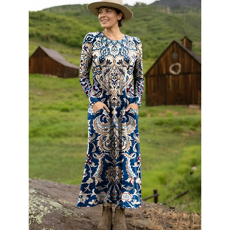 Women's Maxi Dress Sheath Dress T Shirt Dress Tee Dress Vacation Casual Boho Holiday Date Regular Fit Floral Graphic Geometric Long Sleeve Crew Neck Dark Blue Spring Fall Winter