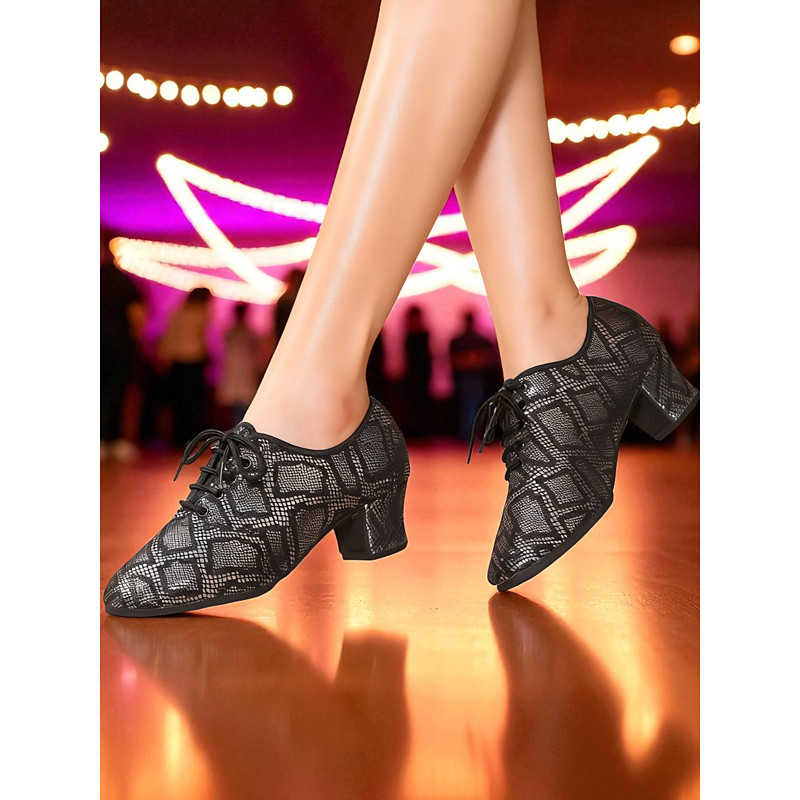 Women's Beige Lace-Up Ballroom Dance Shoes - Low Heel Oxford Style Glitter Pattern Pumps for Professional Dance Party Performances