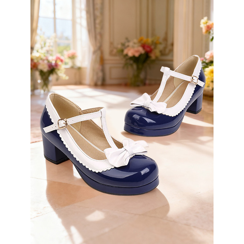 Women's Black and White T-Strap Pumps with Bow Detail – Vintage 1950s Style, Comfortable Block Heels for Formal Events, Weddings and Daily Wear