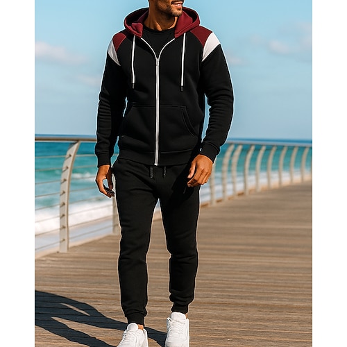 Per uomo Tuta da 2 pezzi Felpa con cappuccio Lounge Set di tute da ginnastica Coulisse Blocco di colori Completo Abbigliamento Autunno Nero Rosso All'aperto Viaggio Sportivo Traspirante Manica Lunga