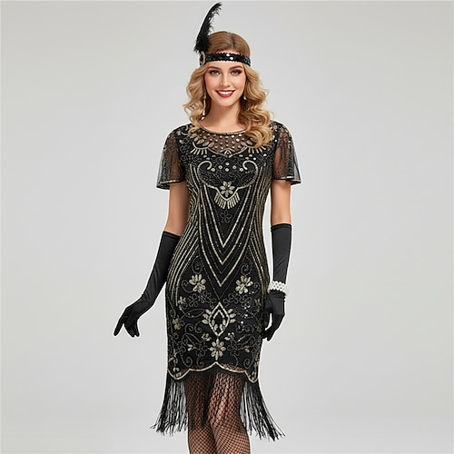 Anni Ruggenti Anni 1920 Abito da cocktail Lunghezza al ginocchio Abito Flapper Abito da cocktail Set di accessori Maniche corte Il grande Gatsby Invitato al matrimonio Paillettes Frangia con nappe