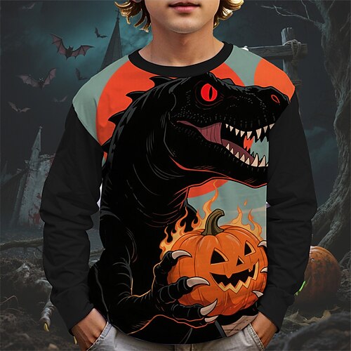 Halloween Jungen 3D Cartoon Kürbis Dinosaurier T-Shirt Langarm Frühling Herbst Mode Basic Kinder 4-12 Jahre Rundhalsausschnitt Outdoor Lässig Täglich Normale Passform