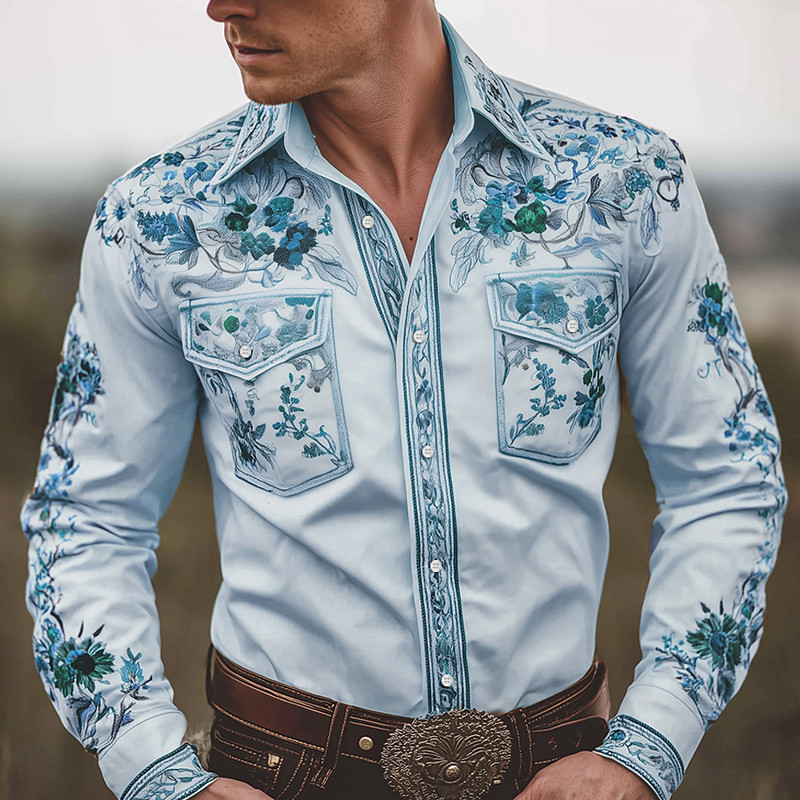 Men's Floral Print Ethnic Flowers Shirt Western Shirt Cowboy Shirt Long Sleeve Vintage Retro Outdoor Casual WorkWear Spring Fall Turndown Front Two Pockets Linen Like Shirt Button Up Shirts Blue