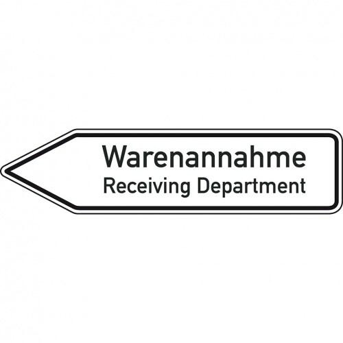 Schild I Wegweiser Warenannahme/Receiving Dep., 2-spr., linksweisend, Aluminium RA0, 1400x350mm, DIN 67520