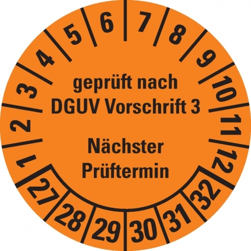 Dreifke® Prüfplakette gepr.n.DGUV Vorschrift 3 NP 27-32,orange,Dokumentenfolie,Ø25mm,500/Rolle
