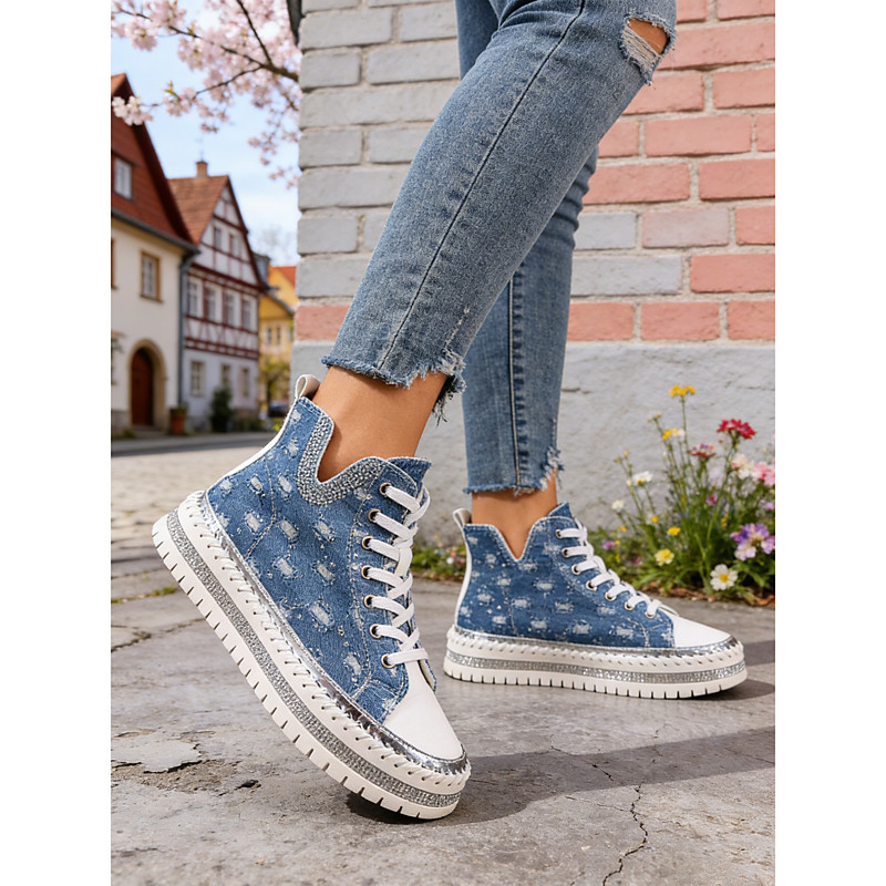 Women's Distressed Denim High-Top Sneakers with Glitter Sole - Trendy Lace-Up Casual Shoes for Concerts, Festivals and Everyday Street Style