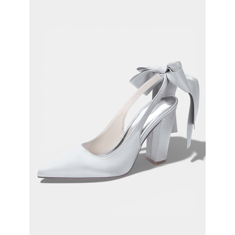 Women's Ivory Pointed-Toe Bow Slingback Heels, Elegant Satin Bridal Shoes for Church Wedding Bride