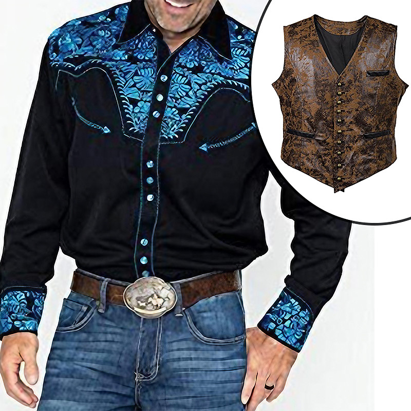 Set with West Cowboy Shirt PU Waistcoat Vest Men's 2 PCS Outfits Long Sleeve Casual Button Down Shirt Retro Vintage Party Carnival Cosplay Costume