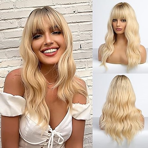 24 Zoll Kunsthaarperücke Damenperücke Blondes langes gewelltes Haar mit Pony Mode Alltagsperücken Weihnachtsfeier