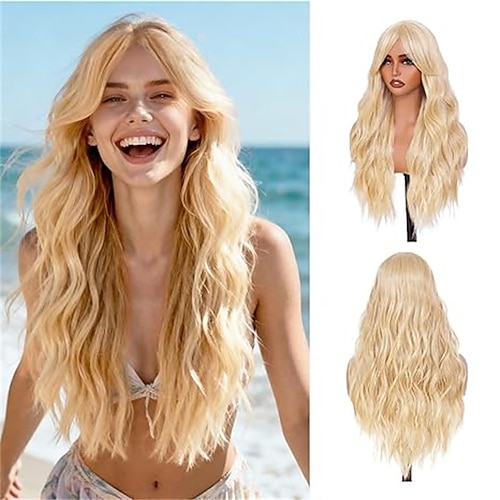 Blonde Perücke mit Curtain Bangs für Damen – lange, gewellte, mit Mittelscheitel versehene, natürlich wirkende Kunsthaarperücke für Alltag, Partys, Cosplay und Kostüme, 66 cm (26 Zoll)