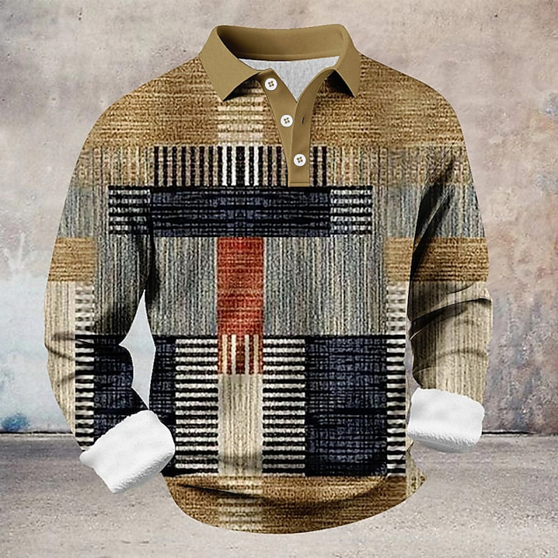 Men's Color Block Geometic Polo Shirts Themmal Shirts Long Sleeve Polo Shirts Lapel Casual Athleisure Holiday Daily Wear 3D Print Spring Fall Winter Blue Brown Gray