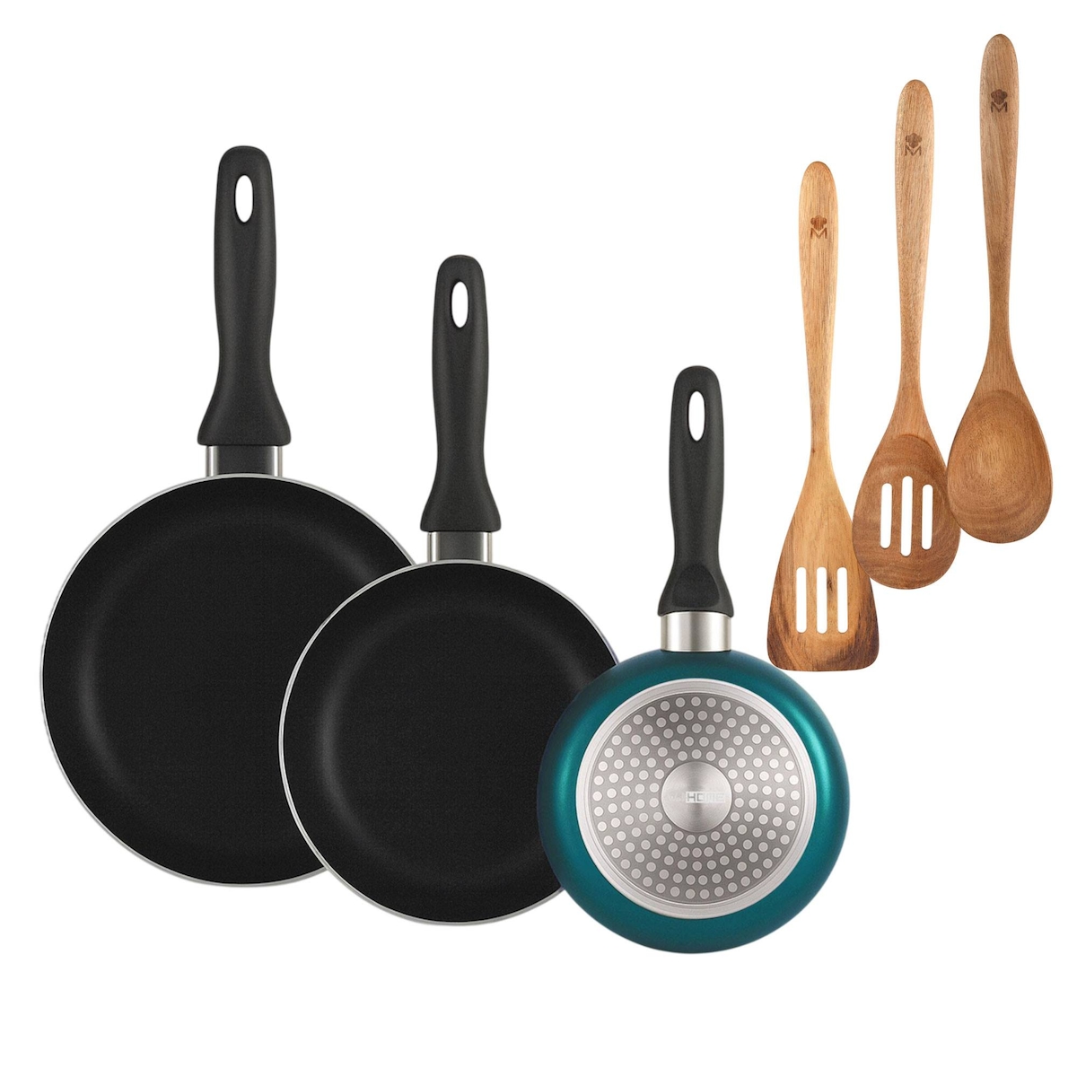 BERGNER - Set aus 3 Pfannen Ø16/20/24cm aus gepresstem Aluminium in metallic-blau mit Set 3 Küchenutensilien 32,8x33x7x1,4 cm Xmart