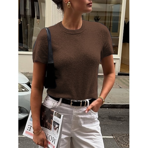 Per donna T-shirt di lana Tinta unica Moda Casual Manica Corta Girocollo Top Regolari Quotidiano Uscire Weekend Vino Blu marino Marrone Grigio scuro Primavera Autunno