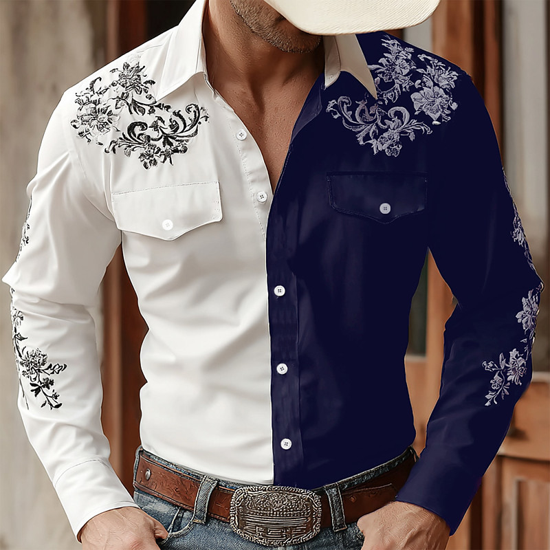 Men's Color Block Floral Print Ethnic Shirt Western Shirt Cowboy Shirt Long Sleeve Vintage Retro Outdoor Casual WorkWear Spring Fall Turndown Front Two Pockets Linen Like Shirt Button Up Shirts Blue