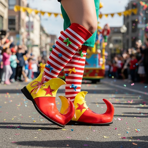 scarpe da clown a righe da uomo, rosse giallo, punta affilata con divertente tacco curvo, vestibilità comoda, perfetto per costumi di carnevale e da clown
