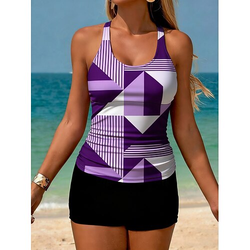 Per donna Costumi da bagno Tankini Due pezzi Vita alta Costume da bagno Controllo della Pancia Vita alta Snello Senza schiena Vacanza Abbigliamento da Spiaggia Grafico Geometrico Collo a U Senza