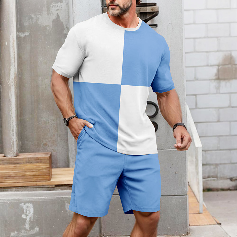 Men's Color Block 2pcs Tees sets Summer Tops Short Sleeve Short Pants Crew Neck Sport Casual Outdoor Vacation Sport 3D Print Summer Green Yellow Blue
