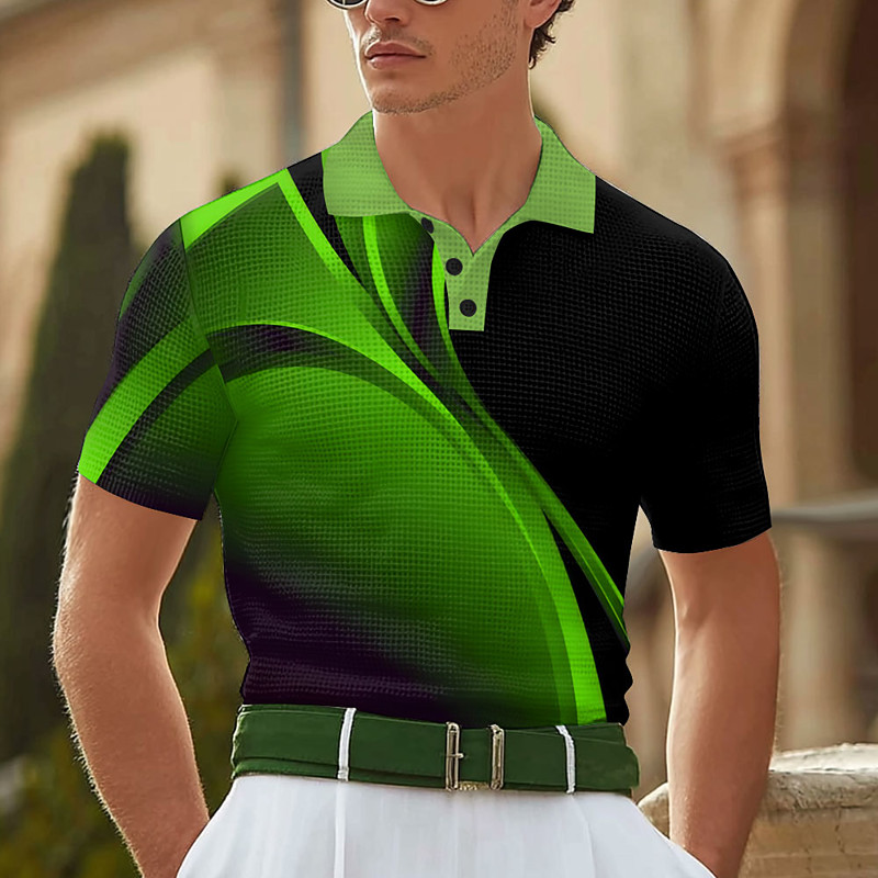 Men's Geometic Line Waffle Polo Shirts Short Sleeve Polo Shirts Collared Shirts Business Casual Business Athleisure Daily Wear 3D Print Buttons Summer Yellow Blue Green